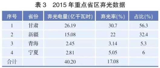 棄光限電。2015年西北地區(qū)的棄光限電成為近兩年來影響光伏發(fā)電行業(yè)發(fā)展的突出問題之一,也影響了光伏項目的收益率和行業(yè)投資熱情。據(jù)有關(guān)統(tǒng)計數(shù)據(jù),2015年全國棄光電量40億千瓦時,總發(fā)電量400億千瓦時,棄光率約10%。棄光限電地區(qū)主要集中在西北地區(qū)的甘肅、青海、新疆、寧夏四省區(qū),詳見表3。據(jù)有關(guān)測算結(jié)果:在考慮20%限電2年的情況下,Ⅰ類光照地區(qū)電價需上升4分錢,Ⅱ類地區(qū)電價需上升得更多。