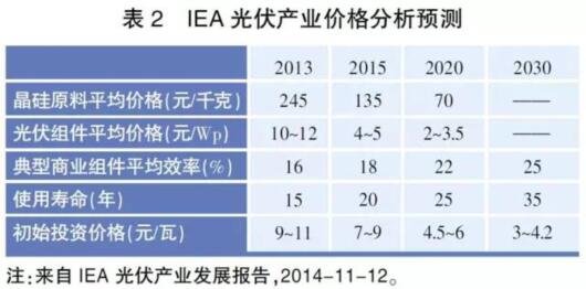 表1預(yù)測成本高于國際能源署(IEA)預(yù)測的國際平均價格,與國際光伏市場相比,該成本仍有較大的下降空間。IEA的光伏產(chǎn)業(yè)價格分析預(yù)測見表2,IEA基于國際光伏電池組件產(chǎn)業(yè)鏈價格下降和組件效率提升的預(yù)測結(jié)果為:2020年國際光伏電站初始投資平均價格將下降至4500~6000元/千瓦,2030年將下降至3000~4200元/千瓦。