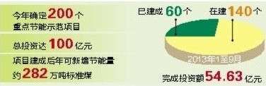 我省在節(jié)能工作中,堅持早選準節(jié)能項目、早留足節(jié)能專項資金,全力推進節(jié)能示范項目建設(shè)。據(jù)悉,今年確定的200個重點節(jié)能示范項目,總投資達100億元,預(yù)計每年可新增節(jié)能量約282萬噸標準煤。1至9月,200個重點節(jié)能示范項目中,已建成投運60個,在建140個,完成投資額54.63億元。