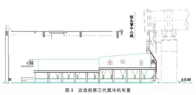 改造之前,第三代篦冷機(jī)窯頭平臺(tái)高10.5m,一段篦床基礎(chǔ)高2.7m,二段篦床基礎(chǔ)高2.1m,熟料小拉鏈機(jī)基礎(chǔ)位于0平面上,見(jiàn)圖1。