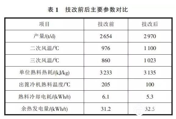 本項(xiàng)目同時(shí)對(duì)預(yù)熱器進(jìn)行了升級(jí)改造,技改后,篦冷機(jī)產(chǎn)量明顯提高,系統(tǒng)煤耗大幅降低,出篦冷機(jī)熟料溫度約為100℃左右,余熱發(fā)電量提高。改造前后主要參數(shù)對(duì)比見(jiàn)表1。表中單位熟料熱耗的降低,一方面歸功于新篦冷機(jī)熱回收效率的提高,另一方面歸功于預(yù)熱器的改造。該方案采用中間輥式破碎機(jī),改造效果顯著,得到認(rèn)可。
