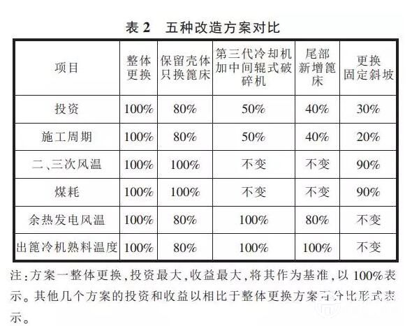 收益分析:本方案保留了原有殼體,節(jié)約了殼體和澆注料費(fèi)用(包含材料費(fèi)用和施工費(fèi)用),可以繼續(xù)使用原有土建支撐,節(jié)省了土建開(kāi)支。投資較少,更換了新的篦床,二、三次風(fēng)溫升高,熱回收率高,可以降低系統(tǒng)熱耗。但受限于原來(lái)殼體大小,篦床面積無(wú)法增大,改造后產(chǎn)量提高不明顯。