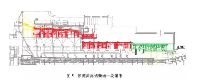 經(jīng)典案例:廣東省某6000t/d生產(chǎn)線,改造前,采用CP第三代篦冷機(jī)及中間輥式破碎機(jī),由于產(chǎn)量提高,出篦冷機(jī)熟料溫度過(guò)高,于2015年3月進(jìn)行技術(shù)升級(jí),在原CP篦冷機(jī)尾端新增一段Sinowalk篦冷機(jī)。原篦冷機(jī)篦床面積133.5m2,改造后的總篦床面積173.3m²,熟料產(chǎn)量7000t/d,出篦冷機(jī)熟料溫度大幅下降,約95℃,同時(shí)余熱發(fā)電量有所提高。技改后的篦冷機(jī)結(jié)構(gòu)見(jiàn)圖5,紅色部分為原篦床,尾端綠色部分為新增Sinowalk篦冷機(jī),熟料下料溜子隨之后移。