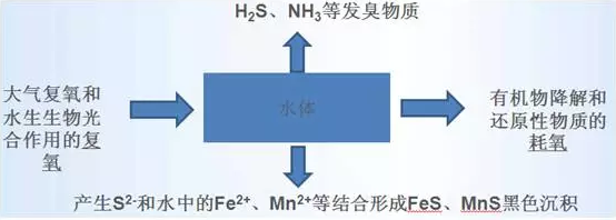 黑臭水體是由于水體缺氧,有機物腐敗而造成的,是有機污染的一種極端現象。水體黑臭是由于大量有機污染物進入水體,在好氧微生物的生化作用下,消耗了水體中大量的氧氣,使水體轉化成缺氧狀態(tài),致使厭氧細菌大量繁殖,導致有機物腐敗、分解、發(fā)酵,轉化為氨氮、腐殖質、硫化氫、甲烷和硫醇等發(fā)臭物質。此過程引起水體中耗氧速率大于復氧速率,造成缺氧環(huán)境,產生的有臭氣體逸出水面進入大氣,水中鐵、錳等重金屬被還原,與水中的硫形成硫化亞鐵等化合物,形成大量吸附了FeS、MnS的帶負電膠體的懸浮顆粒,使水體變黑、變臭(見圖1)。
