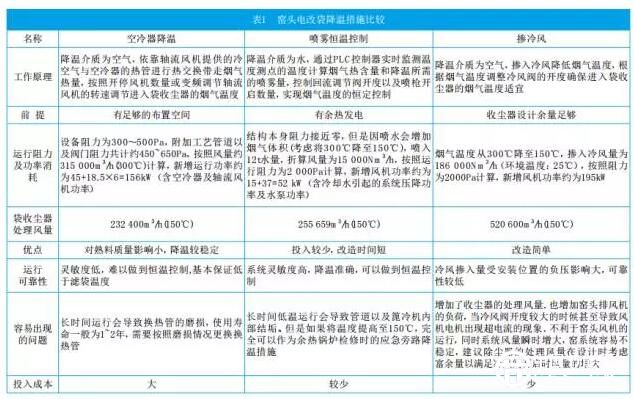 目前主要的降溫措施有3種:(1)空冷器降溫。(2)噴霧恒溫控制降溫(噴水降溫)。(3)摻冷風(fēng)降溫。根據(jù)近幾年的改造實(shí)例和經(jīng)驗(yàn)將這3種降溫措施做出比較見(jiàn)表1(以2500t/d水泥生產(chǎn)線為例)。