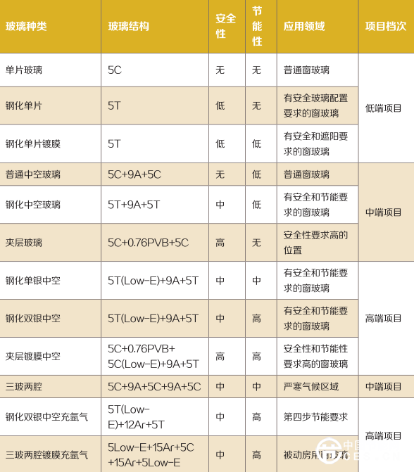住宅玻璃的選材主要從玻璃的種類、結(jié)構(gòu)、安全性和節(jié)能性、應(yīng)用領(lǐng)域和項目檔次等方面進行總結(jié)和介紹。目前,行業(yè)的主流產(chǎn)品匯總?cè)缦卤?所示。