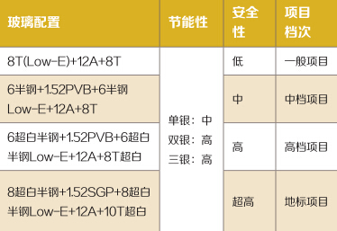 相比住宅玻璃,高層建筑幕墻玻璃的安全性和節(jié)能性要求會更高,綜合玻璃的特性和實際項目的應(yīng)用情況,表2總結(jié)了不同檔次項目幕墻玻璃的結(jié)構(gòu)配置,其中的玻璃配置具有代表性,僅供參考,實際配置要根據(jù)具體項目而定。