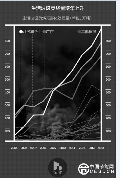 根據(jù)政府的計(jì)劃,截至到2015年,東南沿海省市焚燒方式處理垃圾的比例要超過(guò)一半。但目前尚無(wú)有具體數(shù)據(jù)表明,這個(gè)計(jì)劃究竟完成了多少。但從國(guó)家 統(tǒng)計(jì)局公布的數(shù)據(jù)可以看出,過(guò)去15年,各省生活垃圾焚燒量逐年上升。其中,江蘇、浙江、廣東、山東、福建的生活垃圾焚燒量增長(zhǎng)最快。2005年,江蘇省 只能焚燒42.7萬(wàn)噸垃圾,到了2014年,這個(gè)數(shù)字是871.6萬(wàn)噸,增長(zhǎng)了20倍。