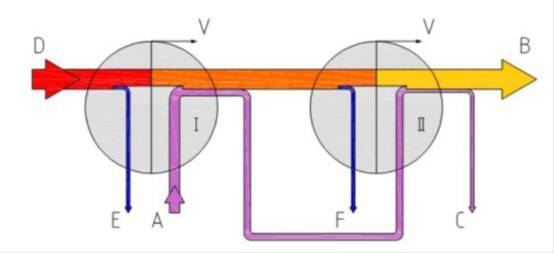 A 產(chǎn)品 B 二次蒸汽 B1 殘余蒸汽 C 濃縮液 D 動(dòng)力蒸汽 E 動(dòng)力蒸汽冷凝水 V 熱損失