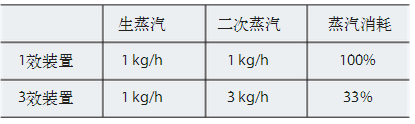 在多效蒸發(fā)裝置中,由新蒸汽加熱第一效產(chǎn)生的蒸汽不進(jìn)入冷凝器,而是作為第二效的加熱介質(zhì)得以再次利用。這樣可以將新蒸汽消耗有效降低約50%。重復(fù)利用此原理,可進(jìn)一步降低新蒸汽消耗。