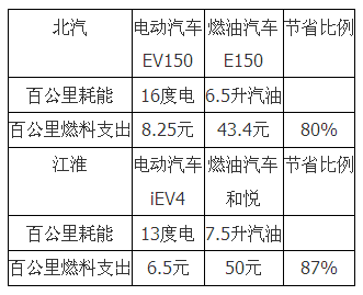 以北汽EV150為例,電動(dòng)汽車每百公里耗電16度,每度電0.5元(私人充電樁按居民電價(jià)收費(fèi),且不執(zhí)行階梯電價(jià)),百公里燃料支出8.25元。同款燃油汽車E150的油耗6.5升/百公里,單價(jià)6.67元,百公里燃料支出43.4元。也就是說使用電動(dòng)車節(jié)約燃料支出80%。
