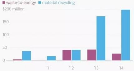 Wang撰寫了勒克斯最近關(guān)于廢物處理行業(yè)風(fēng)險(xiǎn)投資的報(bào)告,其中指出從2011年到2016年4月,風(fēng)投在廢物利用技術(shù)上一共投資了7億美元。在這段時(shí)間里,材料回收投資增加了186%,在2015年達(dá)到了2億美元。同時(shí)垃圾焚燒發(fā)電獲得的投資在過去兩年發(fā)生了下降,從2014年最多的4200萬下降了約50%。
