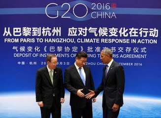 中國(guó)是世界上最大的發(fā)展中國(guó)家、第二大經(jīng)濟(jì)體和溫室氣體排放大國(guó),為《巴黎協(xié)定》的達(dá)成、簽署和生效不斷作出貢獻(xiàn)。習(xí)近平主席提出的“合作共贏、各盡所能”“奉行法治、公平正義”“包容互鑒、共同發(fā)展”的國(guó)際氣候治理理念深入人心,為《巴黎協(xié)定》的達(dá)成發(fā)揮了建設(shè)性引領(lǐng)作用。今年4月22日,張高麗副總理作為習(xí)近平主席特使在紐約代表中國(guó)簽署《巴黎協(xié)定》。中國(guó)作為主席國(guó)推動(dòng)二十國(guó)集團(tuán)首次就氣候變化問(wèn)題發(fā)表主席聲明,推動(dòng)各方簽署協(xié)定。9月3日二十國(guó)集團(tuán)峰會(huì)召開(kāi)前夕,習(xí)近平主席與美國(guó)奧巴馬總統(tǒng)在杭州向聯(lián)合國(guó)秘書(shū)長(zhǎng)潘基文交存《巴黎協(xié)定》批準(zhǔn)文書(shū),為協(xié)定生效進(jìn)程注入關(guān)鍵動(dòng)力。中國(guó)用實(shí)際行動(dòng)向世界表明,中國(guó)是全球氣候治理進(jìn)程的積極參與者、建設(shè)者和推動(dòng)者。
