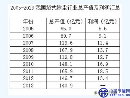 據(jù)2000年統(tǒng)計,袋式除塵器產(chǎn)值僅有17.7億元,而后袋式除塵不斷進步與發(fā)展,所占市場份額也越來越大。下面是2005年到2013年袋式除塵行業(yè)的總產(chǎn)值及利潤狀況情況。