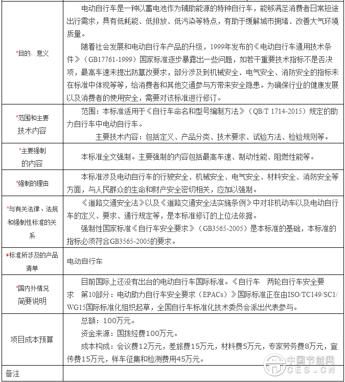 根據(jù)國(guó)家標(biāo)準(zhǔn)委關(guān)于強(qiáng)制性國(guó)家標(biāo)準(zhǔn)整合精簡(jiǎn)工作的安排,現(xiàn)將申請(qǐng)立項(xiàng)的《電動(dòng)自行車安全技術(shù)規(guī)范》國(guó)家標(biāo)準(zhǔn)計(jì)劃項(xiàng)目予以公示(見(jiàn)附件1),截止日期為2016年12月8日。如對(duì)擬立項(xiàng)標(biāo)準(zhǔn)項(xiàng)目有不同意見(jiàn),請(qǐng)?jiān)诠酒陂g填寫《標(biāo)準(zhǔn)立項(xiàng)反饋意見(jiàn)表》(見(jiàn)附件2)并反饋至我司,電子郵件發(fā)送至KJBZ@miit.gov.cn(郵件主題注明:標(biāo)準(zhǔn)立項(xiàng)公示反饋)。