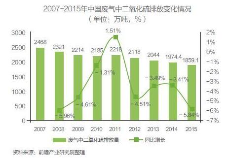 據(jù)前瞻產(chǎn)業(yè)研究院《中國大氣污染治理行業(yè)市場分析報告》顯示,2014年,全國廢氣中二氧化硫排放量為1974.4萬噸,同比下降3.41%。2015年,二氧化硫排放總量為1859.1萬噸,比2014年下降5.8%,比2010年下降18.0%。