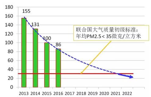 例如,河北省的邢臺市,大氣中PM2.5的年均濃度,2013年是155微克/立方米,是當年全中國空氣質(zhì)量最差的城市,2016年是86微克/立方米;三年時間里下降了45%。按這個速率一直降下去,預計到2022年,可以降到35微克/立方米(世界衛(wèi)生組織的初級階段標準)以下。既然曾經(jīng)大氣質(zhì)量最差的邢臺市的霾都能夠給治了,中國就沒有哪個城市的霾治不了!