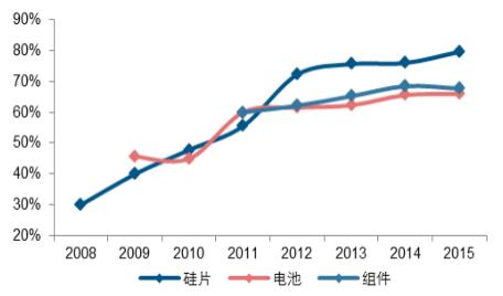 2015 年我國硅片、電池、組件環(huán)節(jié)產(chǎn)能均占全球 70%以上