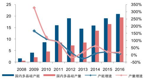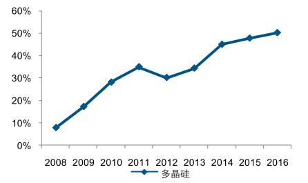2016 年國產(chǎn)多晶硅產(chǎn)量在全球的比重也已超過 50%
