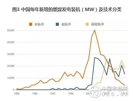 圖3 中國(guó)每年新增的燃煤發(fā)電裝機(jī)(MW)及技術(shù)分類