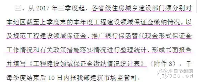 日前住建部發(fā)布建辦市函[2017]460號(hào)文,明確要求各省級(jí)住房城鄉(xiāng)建設(shè)部門須每季度要把推廣銀行保函替代現(xiàn)金形式保證金工作情況和有關(guān)政策措施落實(shí)情況進(jìn)行整理統(tǒng)計(jì),形成書(shū)面報(bào)告,進(jìn)行上報(bào),意思也很明確:各省要加快推廣銀行保函替代現(xiàn)金形式保證金