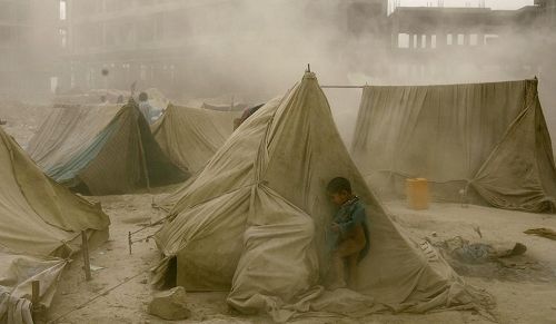 阿富汗難民兒童在帳篷后邊躲避沙塵暴