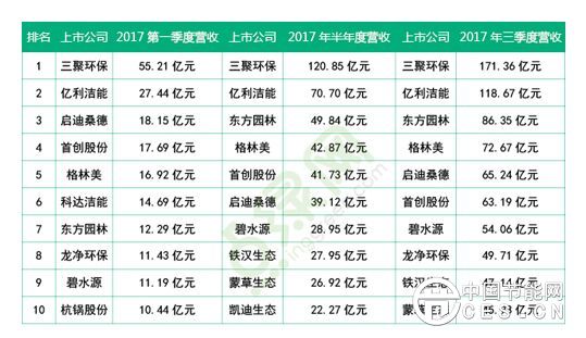 假如,環(huán)保企業(yè)也有屬于自己的“雙十一購物節(jié)”,那么有哪些企業(yè)會在TOP10排行榜,各自的競爭優(yōu)勢又是什么呢?點綠網(wǎng)根據(jù)2017年第一季度、半年度、第三季度報告營收前十名進行粗略統(tǒng)計分析,以此為參考。