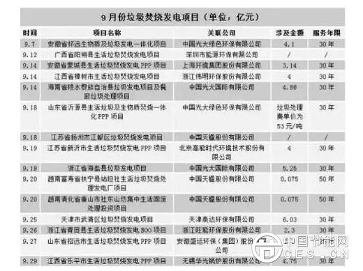據(jù)不完全數(shù)據(jù)顯示,2017年9月共公開(kāi)了15個(gè)垃圾焚燒發(fā)電項(xiàng)目,涉及金額超40億。中國(guó)光大綠色環(huán)保有限公司公開(kāi)的3個(gè)新項(xiàng)目,總投資逾9億元,浙江省海鹽縣的垃圾發(fā)電項(xiàng)目單筆價(jià)值也在5億左右,江西樂(lè)平市垃圾焚燒項(xiàng)目也預(yù)計(jì)投資約4.7億元。