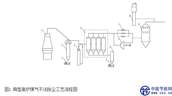 1-高爐,2-旋風(fēng)除塵器,3-罐車,4-煤氣換熱器,5-布袋除塵器,6-灰倉,7-減壓閥組,8-TRT,9-噴堿脫氯裝置,10-管網(wǎng)放散塔