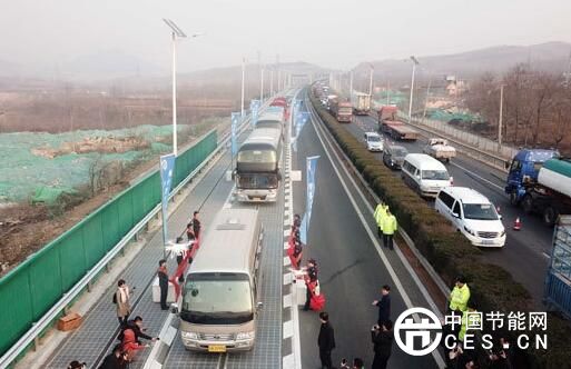 28日下午,位于濟(jì)南繞城高速南線的全國首個(gè)承載式光伏高速公路試驗(yàn)段正式建成通車。