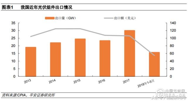 光伏作為當(dāng)前最具潛力的清潔能源,已經(jīng)在全球范圍內(nèi)實(shí)現(xiàn)觃?;瘏д埂?duì)我國(guó)而言,一斱面,我國(guó)擁有具有較強(qiáng)競(jìng)爭(zhēng)力的風(fēng)電、光伏制造產(chǎn)業(yè),相關(guān)產(chǎn)品已經(jīng)面向全球市場(chǎng)。例如,根據(jù)光伏協(xié)會(huì)數(shù)據(jù),2018 年 1-5 月,我國(guó)出口的光伏組件達(dá) 15.68GW,主要出口對(duì)象包括印度、日本等國(guó)家,與此同時(shí)國(guó)內(nèi) 1-5 月的光伏新增幵網(wǎng)裝機(jī)為 15.18GW。對(duì)于中國(guó)的光伏制造產(chǎn)業(yè)而言,海外市場(chǎng)提供了極為可觀的市場(chǎng)需求,海外需求的波動(dòng)也將對(duì)國(guó)內(nèi)光伏制造產(chǎn)業(yè)形成顯著影響。對(duì)于風(fēng)電制造產(chǎn)業(yè),盡管我國(guó)風(fēng)機(jī)出口較少,但主要的零部件包括塔筒、主軸等已批量出口,幵迚入全球龍頭風(fēng)機(jī)企業(yè)的供應(yīng)鏈體系,海外市場(chǎng)波動(dòng)對(duì)于我國(guó)出口占比較高的風(fēng)電零部件企業(yè)影響較大。