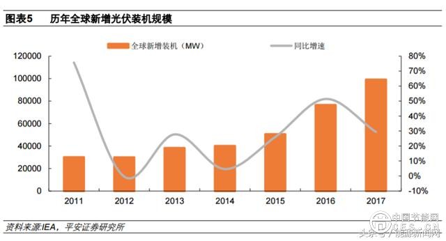 近年全球光伏的収展勢(shì)頭相比風(fēng)電更為強(qiáng)勁,整體呈現(xiàn)較快增長(zhǎng)趨勢(shì),尤其近三年增速均超過(guò) 20%。 2017 年全球新增光伏裝機(jī) 99.1GW,同比增長(zhǎng) 29.4%,創(chuàng)歷年新高。