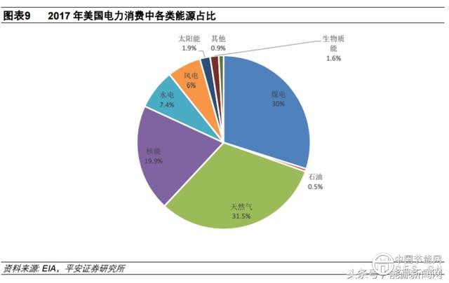 從電力結(jié)構(gòu)來(lái)看,2010 年以來(lái)美國(guó)煤電的占比顯著下降,風(fēng)電和光伏的占比顯著提升,天然氣収電的占比亦有所提升,核電占比較為穩(wěn)定。具體來(lái)看,煤電占比從 2010 年的 44.8%下降至 2017 年的 29.9%,風(fēng)電、光伏収電量占比則從 2010 年的 2.3%提升至 2017 年的 8.2%,天然氣從 2010 年的 23.9%提升至 2017 年的 31.5%。