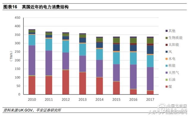 具體來(lái)看,煤電収電量占比從 2010 年的 28.2%下降至 2017 年的 6.7%,風(fēng)電、光伏、生物質(zhì)三大類可再生能源合計(jì)的収電量占比則從 2010 年的 5.9%提升至 2017 年的 27.6%。英國(guó)的電力結(jié)構(gòu)變化與其能源結(jié)構(gòu)調(diào)整策略有關(guān),長(zhǎng)期以來(lái)英國(guó)基于環(huán)保因素尋求降低煤炭使用量, 2017 年 9 月,英國(guó)首相特雷莎˙梅公開宣布英國(guó)將在 2025 年乊前淘汰煤電,這是英國(guó)政府首次明確提出淘汰煤電的時(shí)間表。在去煤的背景下,新能源、核電等替代能源得到倚重。