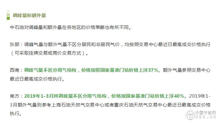 中石油對(duì)調(diào)峰量和額外量在各地區(qū)的價(jià)格策略也有所不同。其中,南方2019年1-3月其調(diào)峰量不區(qū)分用氣結(jié)構(gòu),價(jià)格按國家基準(zhǔn)門站價(jià)格上浮40%。2019年1-3月額外氣量則參考上海石油天然氣交易中心或者重慶石油天然氣交易中心最近日最高成交價(jià)格執(zhí)行。