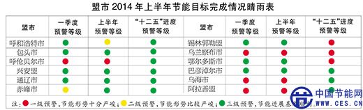 按照國(guó)家節(jié)能降耗年度目標(biāo)任務(wù)要求,通過(guò)對(duì)各盟市節(jié)能情況的分析,大部盟市節(jié)能形勢(shì)較好,但部分盟市能耗水平不降反升,節(jié)能形勢(shì)不容樂(lè)觀。上半年,呼倫貝爾市、烏蘭察布市、烏海市、阿拉善盟等4個(gè)盟市預(yù)警等級(jí)為一級(jí),節(jié)能形勢(shì)十分嚴(yán)峻;呼和浩特市預(yù)警等級(jí)為二級(jí),節(jié)能形勢(shì)比較嚴(yán)峻;包頭市、興安盟、通遼市、赤峰市、錫林郭勒盟、鄂爾多斯市、巴彥淖爾市等7個(gè)盟市預(yù)警等級(jí)為三級(jí),節(jié)能進(jìn)展基本順利。