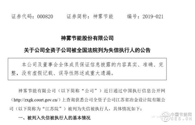 2月25日,神霧節(jié)能發(fā)布公告稱,因公司未在期限內(nèi)履行生效法律文書確定的給付義務(wù),因而被全國法院列入失信被執(zhí)行人名單。