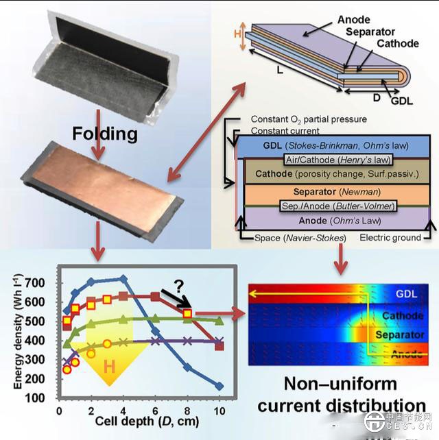 Heung Chan Lee等人通過(guò)采用高比表面積的CNT導(dǎo)電劑,優(yōu)化碳/電解液比例,采用高離子電導(dǎo)率的聚合物離子液體隔膜和超薄空氣擴(kuò)散層(GDL),以及折疊結(jié)構(gòu)的設(shè)計(jì)等方法將Li-O2電池在全電池的層級(jí)的能量密度大幅提升到了1214Wh/kg,體積能量密度達(dá)到896Wh/L,是Li-O2電池設(shè)計(jì)上的一次重大進(jìn)展。