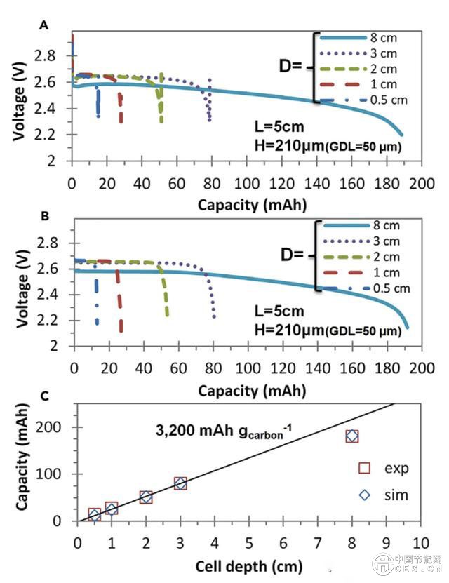 在Li-O2電池放電的過(guò)程中,正極表面會(huì)形成Li2O2產(chǎn)物逐漸覆蓋正極表面,使其失去反應(yīng)活性,我們看到當(dāng)電池的寬度為2cm時(shí),放電過(guò)程中電池正極碳材料表面的Li2O2層的厚度變化是均勻的,但是對(duì)于8cm寬的電池,Li2O2層厚度的增加是非均勻的,從O2的入口處開(kāi)始增加,逐漸擴(kuò)散到電池的尾部。因此對(duì)于Li-O2電池而言電池的寬度并不是越寬越好,而是存在一個(gè)最大寬度,例如對(duì)于50um厚的GDL層和0.24mA/cm2的電流密度,電池的最大寬度不應(yīng)超過(guò)6cm。