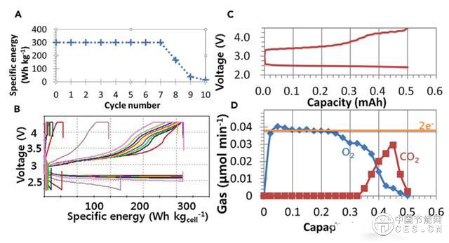 下圖為正極采用CNT后的Li-O2電池在300Wh/kg能量密度下的循環(huán)性能,從下圖A中能夠看到該電池的循環(huán)性能并不是十分理想,還需要進(jìn)行繼續(xù)的優(yōu)化處理。