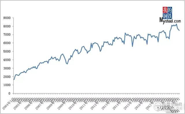 圖2:2004年-2019年中國(guó)粗鋼逐月產(chǎn)量對(duì)比圖