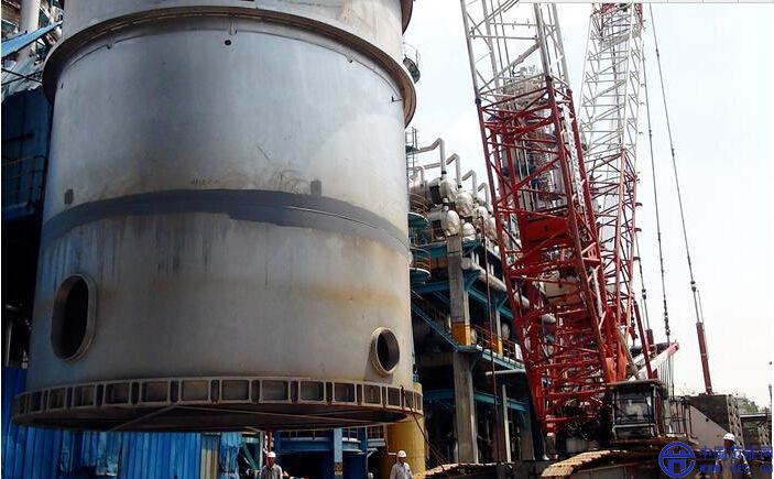 圖為9月3日,綜合脫硫塔首段成功吊裝。