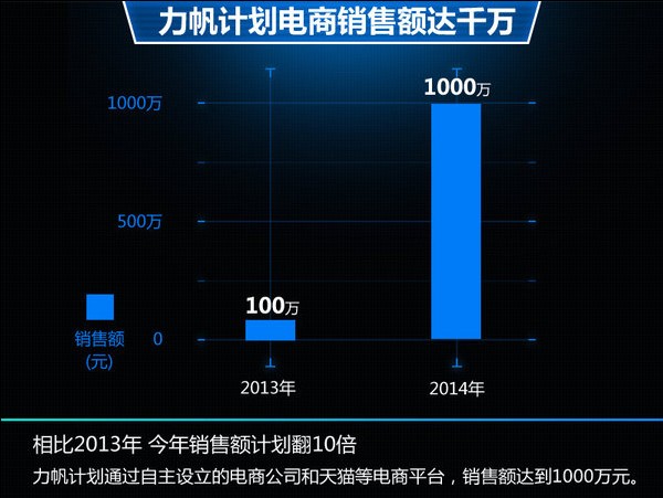 雖然此次力帆汽車(chē)將是首次觸及電商平臺(tái),但是集團(tuán)摩托車(chē)業(yè)務(wù)早在2013年便已正式在天貓店銷(xiāo)售零部件及整車(chē),并取得了100多萬(wàn)元的電商銷(xiāo)售額。此前尹明善還公開(kāi)宣布:今年力帆將設(shè)立電子商務(wù)公司,從而實(shí)現(xiàn)銷(xiāo)售額達(dá)到1000萬(wàn)元以上。這一目標(biāo)也達(dá)到去年銷(xiāo)售額的10倍。