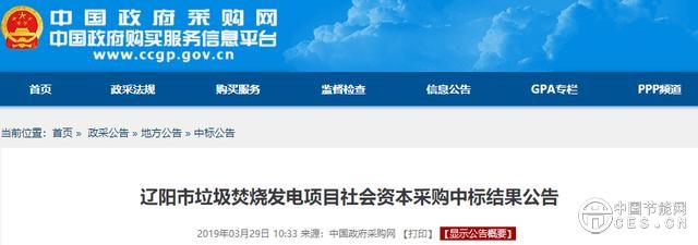 3月29日,遼寧省遼陽市垃圾焚燒發(fā)電項目發(fā)布社會資本采購中標(biāo)結(jié)果公告,中國光大國際有限公司成為中標(biāo)的社會資本方,項目總投資8.12億。