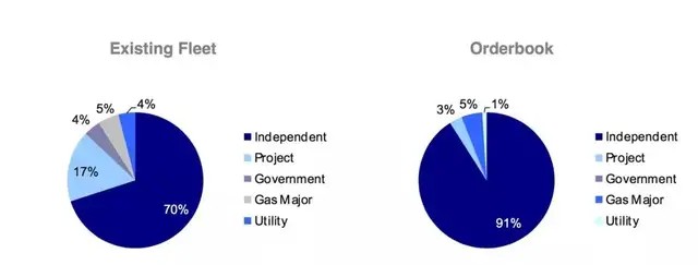 以往LNG運輸船隊通常集中在大型航運業(yè)主,如馬來西亞的MISC,韓國的K-Line,卡塔爾的Nakilat和日本的Mitsui OSK Lines以及Nippon Yusen Kabushiki Kaisha Lines。根據(jù)Banchero Costa的數(shù)據(jù),12家最大的業(yè)主仍控制著大約一半的交易船隊,約占訂單總量的30%。