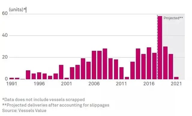 意大利船舶經(jīng)紀(jì)公司Banchero Costa的研究負(fù)責(zé)人Ralph Leszczynski認(rèn)為,2018年和2019年(占目前訂單的94%)的交付速度將影響未來多年的行業(yè)趨勢。