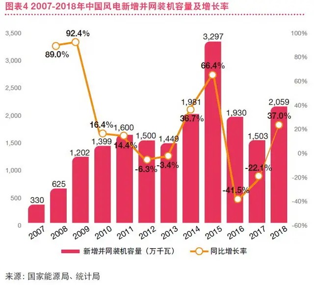 在風(fēng)電領(lǐng)域,我國棄風(fēng)限電狀況明顯緩解,風(fēng)電裝機(jī)容量逆勢增長。數(shù)據(jù)顯示,2018年,全國新增并網(wǎng)風(fēng)電裝機(jī)2059萬千瓦,累計(jì)并網(wǎng)裝機(jī)容量達(dá)到1.84億千瓦,占全部發(fā)電裝機(jī)容量的9.7%;風(fēng)電發(fā)電量3660億千瓦時(shí),占全部發(fā)電量的5.2%,比2017年提高0.4個(gè)百分點(diǎn);全年棄風(fēng)電量277億千瓦時(shí),同比減少142億千瓦時(shí),平均棄風(fēng)率7%,同比下降5個(gè)百分點(diǎn)。