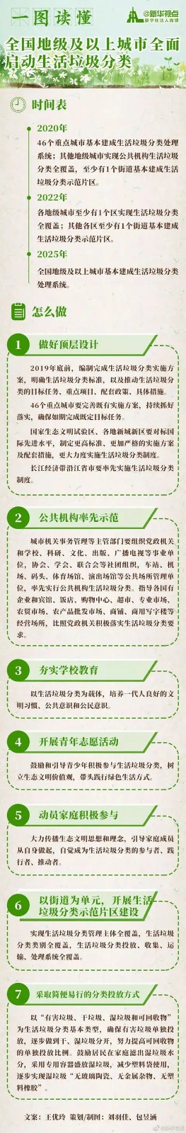 《通知》要求,到2020年,46個重點(diǎn)城市基本建成生活垃圾分類處理系統(tǒng)。其他地級城市實(shí)現(xiàn)公共機(jī)構(gòu)生活垃圾分類全覆蓋,至少有1個街道基本建成生活垃圾分類示范片區(qū)。到2022年,各地級城市至少有1個區(qū)實(shí)現(xiàn)生活垃圾分類全覆蓋,其他各區(qū)至少有1個街道基本建成生活垃圾分類示范片區(qū)。到2025年,全國地級及以上城市基本建成生活垃圾分類處理系統(tǒng)。