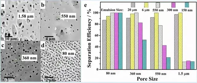 圖4 PEP孔徑調(diào)控以及對(duì)不同粒徑乳液的高效分離