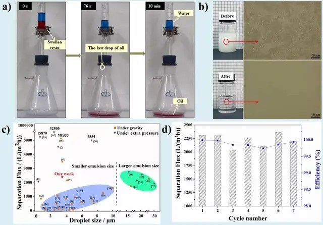 在無(wú)需外加壓力條件下,PEP依靠油水混合自身重力可實(shí)現(xiàn)對(duì)油水乳液的高效分離,對(duì)粒徑為3.5 μm的乳液分離通量達(dá)到2306.78 L (m2h)-1,且多次循環(huán)使用后,PEP仍保持很高的分離效率和分離通量。